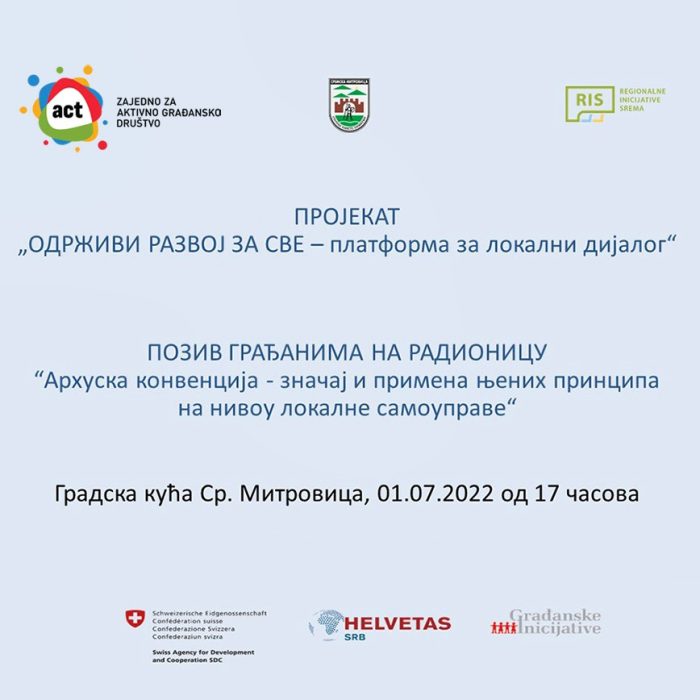U petak, 1. jula, sa početkom u 17 časova u prostorijama Gradske kuće u Sremskoj Mitrovici biće održana radionica o Arhuskoj konvenciji. Radionicu organizuju Regionalne inicijative Srema i Grad Sremska Mitrovica u okviru projekta za koji su podržani ACT grantom kroz grant šemu Partnerske inicijative.